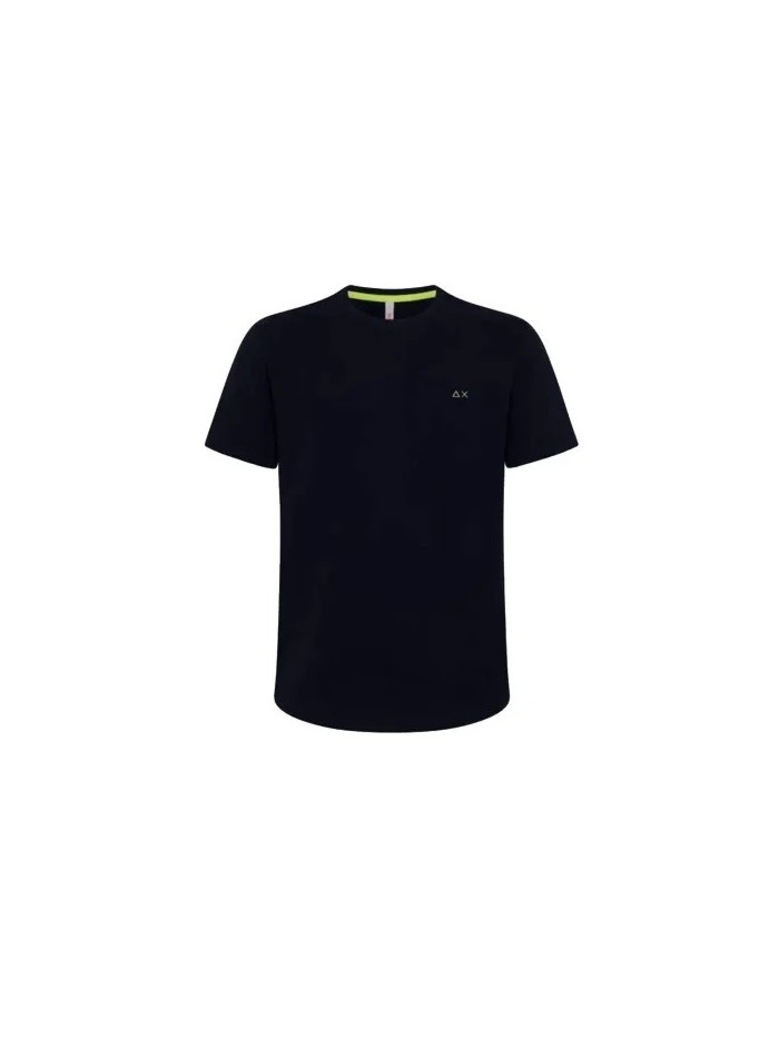 Maglia basic blu navy, girocollo con scollo e polsini a costine, e logo ricamato.