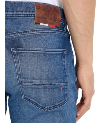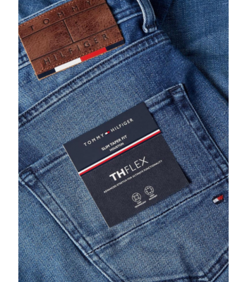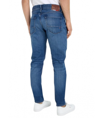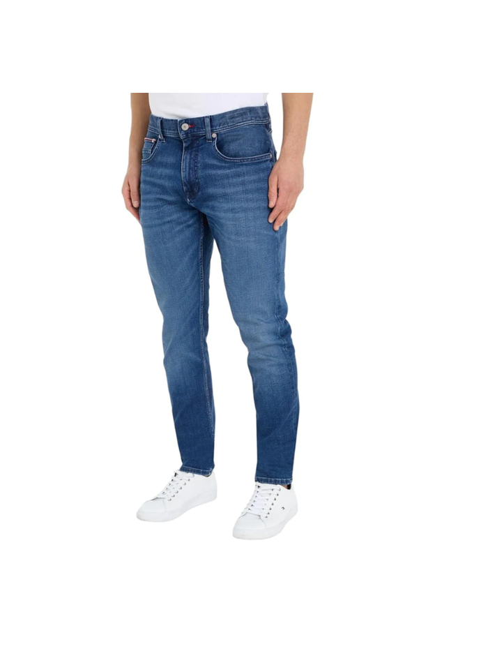 Jeans dalla tonalità media, vestibilità slim taper fit, vita standard, gamba affusolata, chiusura con zip.