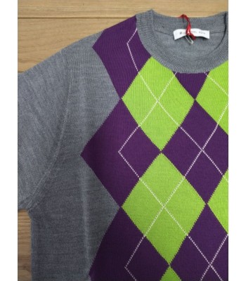 Maglia caratterizzata da una lavorazione a trecce e rombi. Questo capo presenta strass, scollo rotondo, bordi a costine e giromanica sceso.