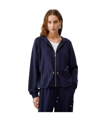 Felpa in neoprene, cappuccio in tono colore, chiusura con zip, coulisse in vita, logo ricamato sulla manica.