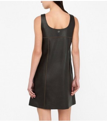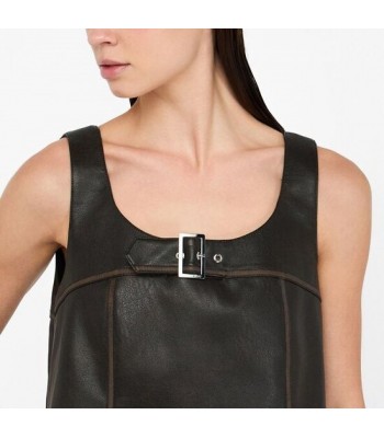Abito corto in tessuto spalmato, sorretto a spalline larghe, scollo ampio e fibbia decorativa.