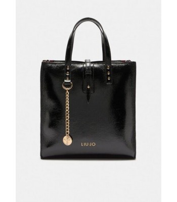 Borsa a mano lucida piccola, mini borchie applicate e logo in metallo. Tracolla regolabile e rimovibile, charm logato con catena con fodera a contrasto.