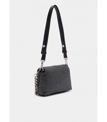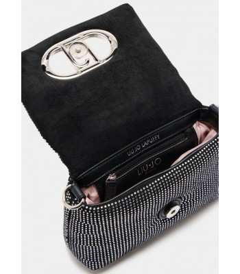 Borsa a tracolla LaPuffy in microfibra con strass applicati, logo in metallo, comodo manico rimovibile a catena. Tracolla regolabile e rimovibile con tasca interna.