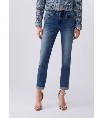 Jeans in denim stretch, lavaggio used, taglio bottom up, vita regolare e gamba skinny. Lunghezza sopra la caviglia e risvolto sul fondo.