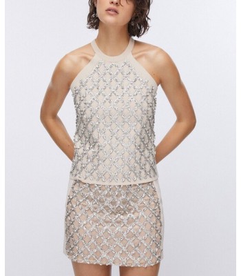 Top in maglia punto milano, filati in misto viscosa, ricami gioiello sul davanti.