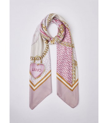Foulard grande in tessuto stampato, maxi fiocco, busta logata in abbinamento.