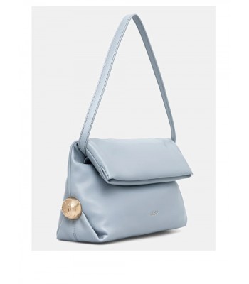 Borsa a tracolla media, scomparto centrale, chiusura a patta magnetica e dettaglio del logo laterale.