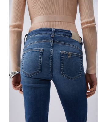 Jeans in denim stretch, vita media, gamba skinny, lunghezza sopra la caviglia, risvolto con strass.