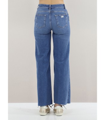 Jeans cropped in denim elasticizzato, vita regolare, 5 tasche e fondo tagliato a vivo. Logo di strass.