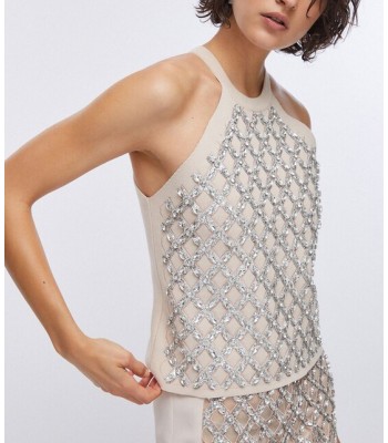Top in maglia punto milano, filati in misto viscosa, ricami gioiello sul davanti.