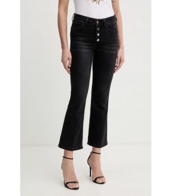 Jeans lavaggio stonewash con graffiature, modello cinquetasche, vita alta, gamba leggermente a zampa e bottoni gioiello.