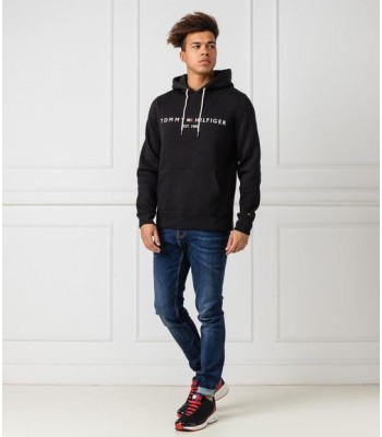 Felpa in misto cotone blu con cappuccio regolabile con coulisse a contrasto, logo Tommy Hilfiger ricamato sul fronte, tasca a marsupio, polsi e fondo a costina e dettaglio signature sulla manica. Vestibilità Regolare.