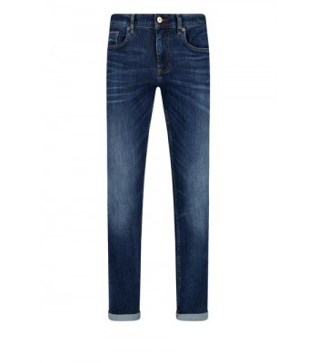 Jeans dal lavaggio scuro, 5 tasche , anteriori e posteriori, e etichetta ricamata sulla tasca posteriore.